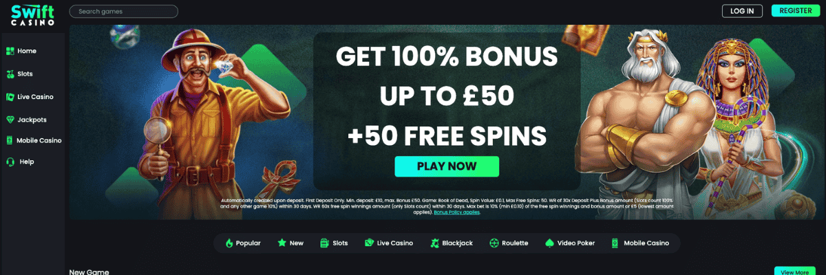 Swift Casino gives new players a warm start with its welcome bonus: a 100% match up to £50. To unlock the offer, you’ll need to use the bonus code SWIFT when making your first deposit.