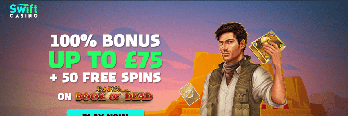As part of the welcome package, Swift Casino gives you 50 free spins on Book of Dead. Each spin is fixed at £0.10 and credited automatically once you claim the first deposit bonus. Any winnings from these spins are treated as bonus funds and come with a 60× wagering requirement, which is higher than the main welcome bonus.