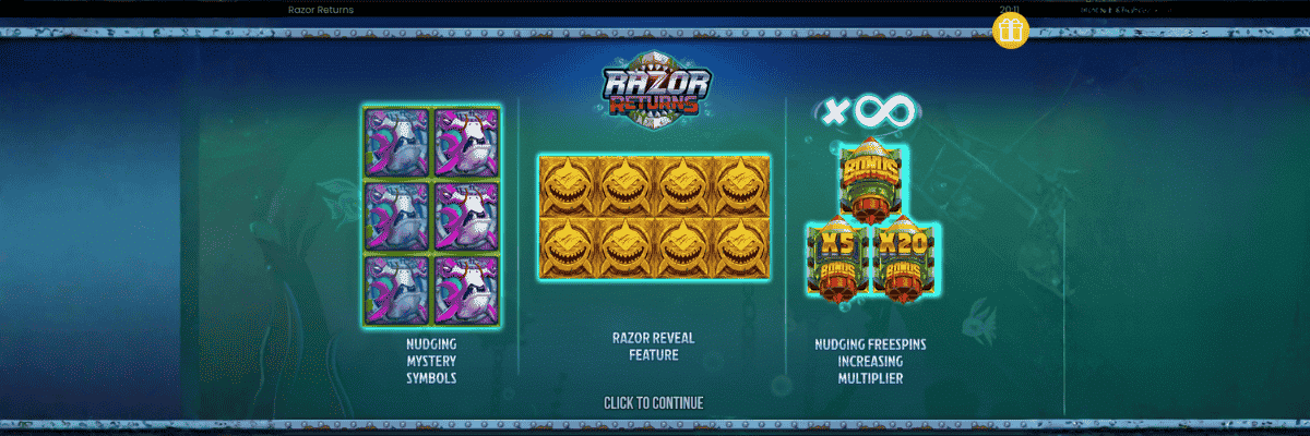 Razor Returns is all about chasing that huge 100,000x max payout. The main attraction is the Free Spins round, where the win multiplier keeps climbing with every nudge. The Razor Reveal feature also adds some decent potential to the base game.