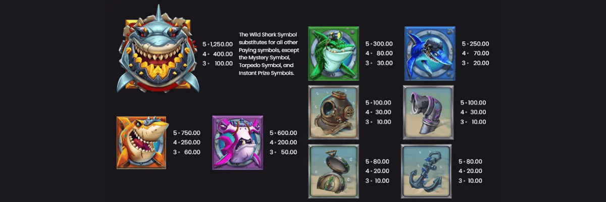 - Wild Shark: 3, 4, or 5 = 1x, 4x, or 12.5x bet